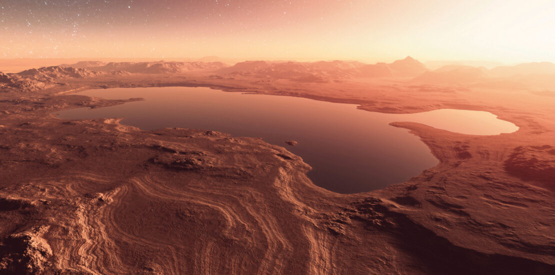An artist’s impression of an ancient, watery Martian landscape. Billions of years ago, rivers carved intricate valley networks and lakes pooled in craters, yet today Mars is largely dry. Seismic investigations show that much of this ancient surface water may now reside in the subsurface (© iStock).