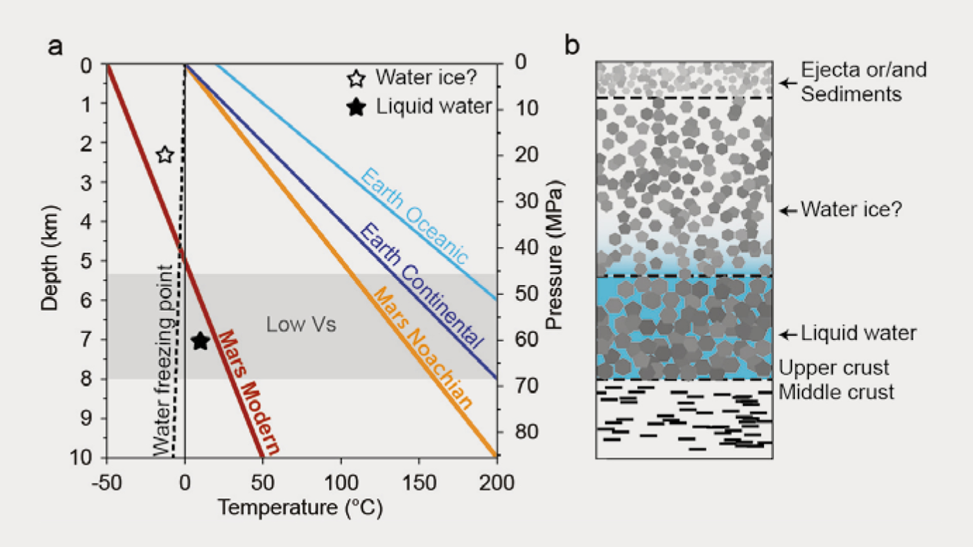 Figure 3 | Water storage model. (a) Thermal profiles for Earth and Mars (adapted from Michalski et al., 2018). Black line, water freezing point with pressure (dashed, pure water; continuous, seawater). Grey, a low-velocity zone indicating the upper crustal base containing liquid water. (b) Schematic model for water storage in Mars’ upper crust. (© Sun et al., 2025; Published by Oxford University Press on behalf of China Science Publishing & Media Ltd. under a CC BY license.)