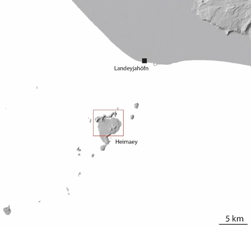 Northern Heimaey showing the Helgafell and Eldfell volcanic cones to the south and the mountains Ystiklettur, Miðklettur and Heimaklettur to the north. Map adapted from Landmælingar Íslands (www.lmi.is/is)